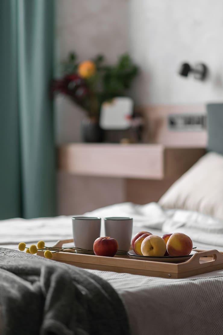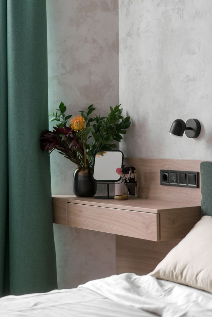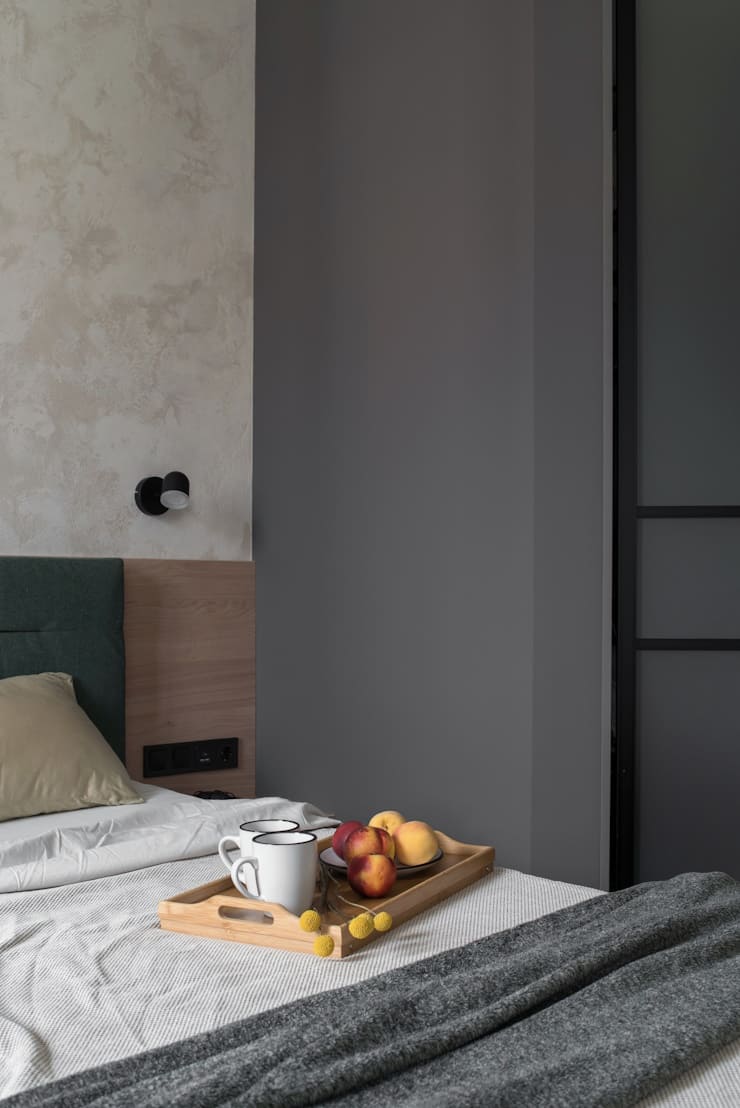 Dla sypialni zdecydowaliśmy się pójść w stronę odcieni piaskowych, aby pomieszczenie kojarzyło się z ciepłem, miękkością, i wprowadziliśmy trochę grafitu, aby pokój nie wyglądał na bezkształtną beżową mieszankę.