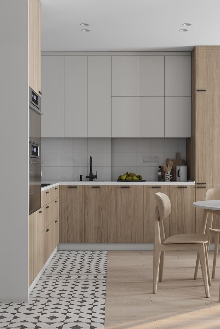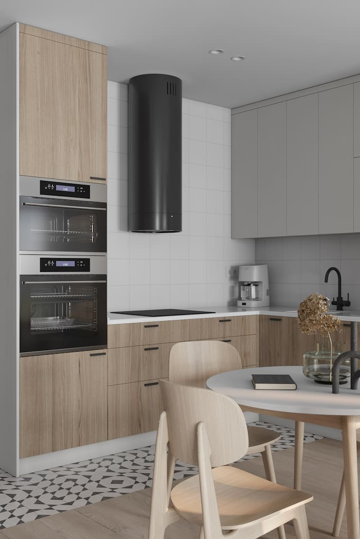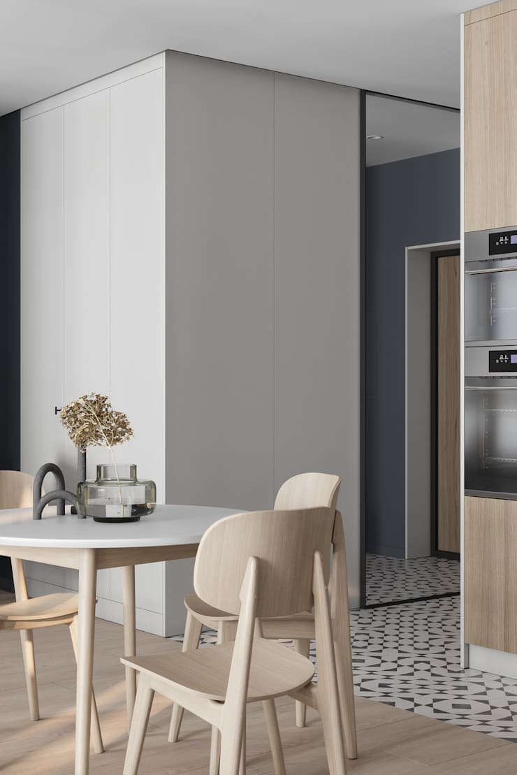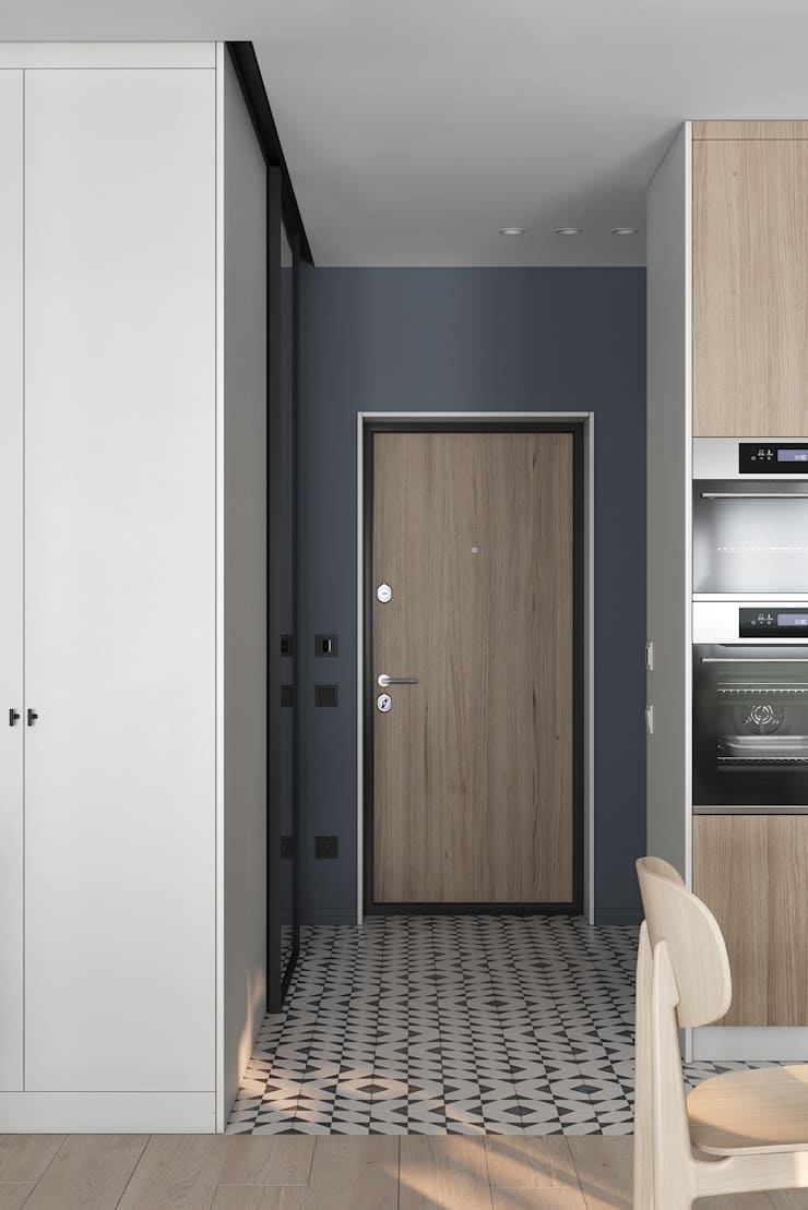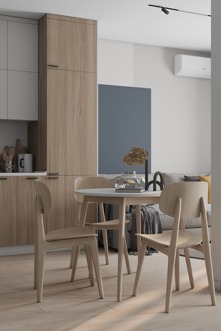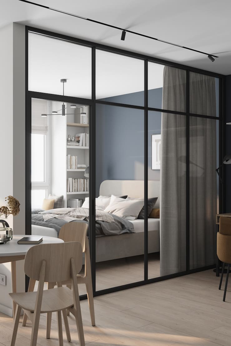 Od dewelopera mieszkanie składało się z osobnej kuchni i pokoju, ale po naszej przebudowie stworzyliśmy studio - kuchnię połączoną z salonem, przestrzeń do pracy i przytulną sypialnię. Aby stworzyć poczucie przestrzeni, zainstalowaliśmy szklaną ścianę oddzielającą sypialnię od głównego pomieszczenia, chociaż oczywiście taki wybór może wpłynąć negatywnie na izolację dźwiękową. Jednakże, gdy masz do czynienia z niewielką powierzchnią mieszkania, czasami konieczne jest zawieranie kompromisów.